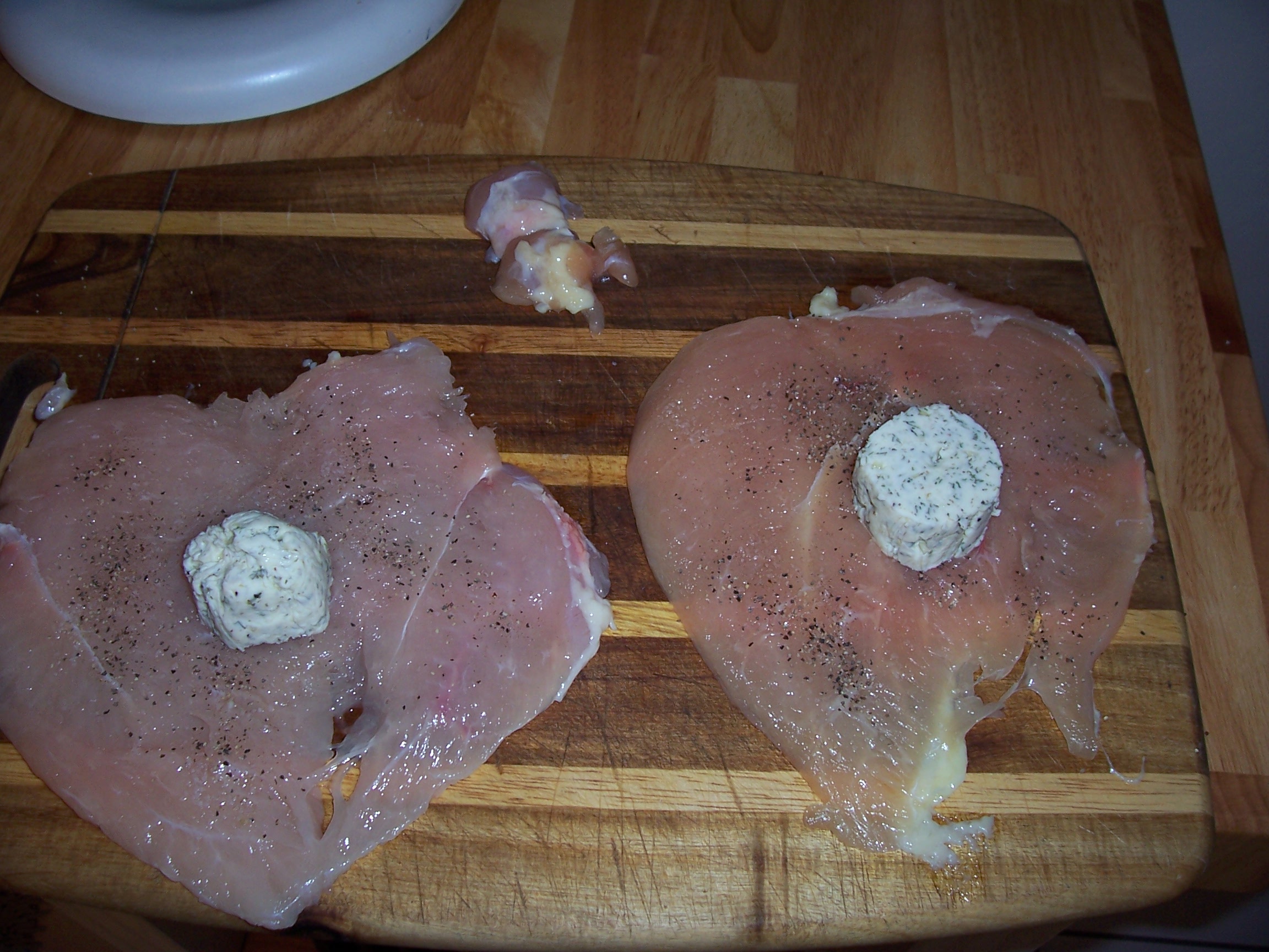 - Place a piece of parchment paper or plastic wrap sprinkled with a little water on a sturdy surface. Put the chicken on it and cover with a second piece. Place the butter about 1/3 of the way down the chicken and pull chicken over the butter, then fold in the sides and roll tightly. Place onto a sheet pan or plate flap side down and put into the refrigerator or freezer to firm up.Pound until about 1/8 of an inch in thickness. Right before cooking take 3 bowls, in one place the flour, the eggs in a second,and the panko in the third. Roll the chicken into the flour, dip to cover in the egg wash and place into the panko and bread completely.